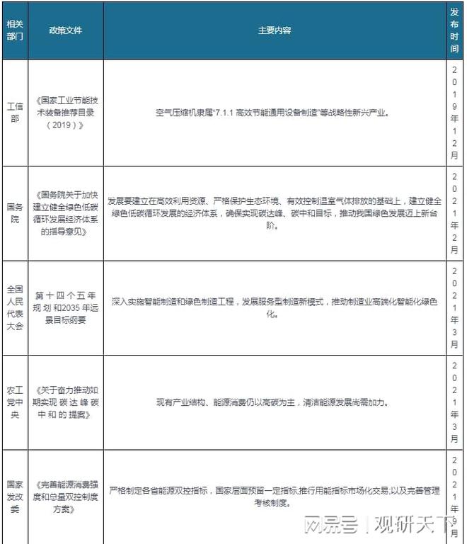 政策東風已至,節(jié)能降耗型空壓機前景可期。據(jù)統(tǒng)計,空壓機耗電量約占大型工業(yè)設備(如風機、水泵、鍋爐等)總耗電量的 15%,占發(fā)電總量的 9%左右??諝鈮嚎s機作為工業(yè)用能設備,其能效水平對工業(yè)節(jié)能目標的實現(xiàn)有著重要影響。當前我國經(jīng)濟發(fā)展目標正在由高速增長向增長轉換,加強工業(yè)節(jié)能管理,持續(xù)提源利用效率,以推動綠色低碳循環(huán)發(fā)展。